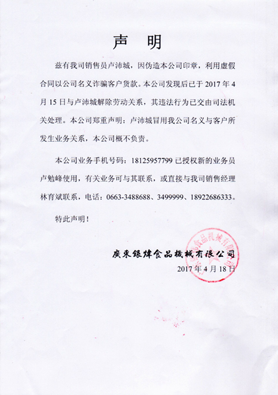 我司銷售員盧沛城,因偽造本公司印章,利用虛假合同以公司名義詐騙客戶貨款。本公司發現后已于2017年4月15日與盧沛城解除勞動關系,其違法行為已交由司法機關處理。