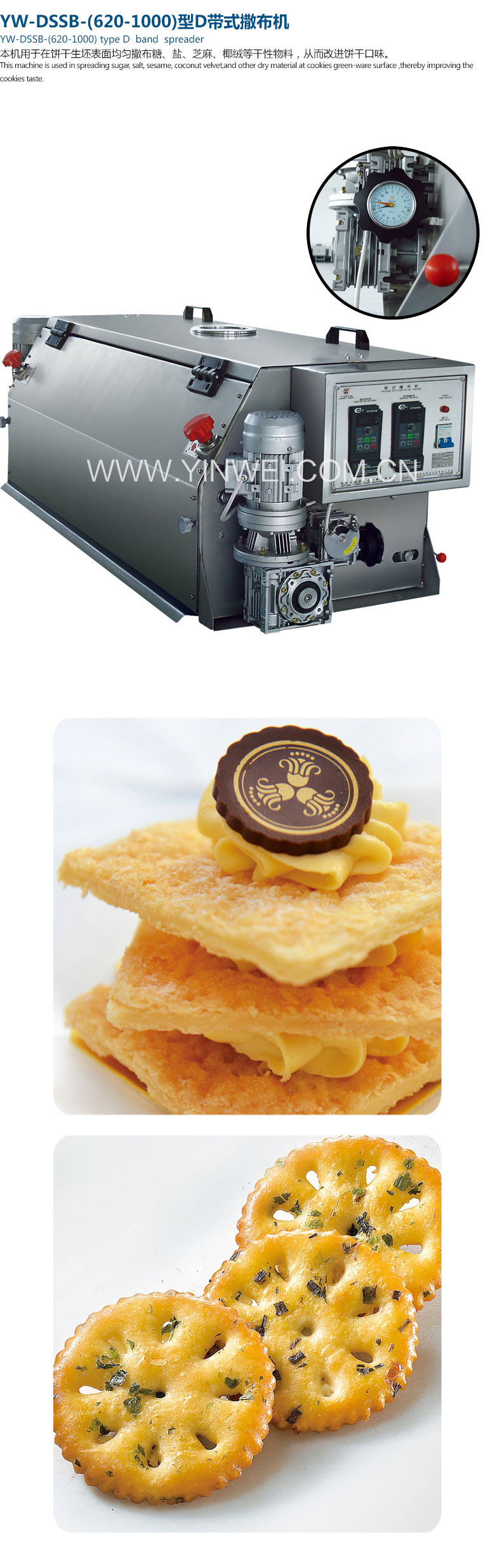 本機用于在餅干生坯表面均勻撒布糖、鹽、芝麻、椰絨等干性物料,從而改進餅干口味。