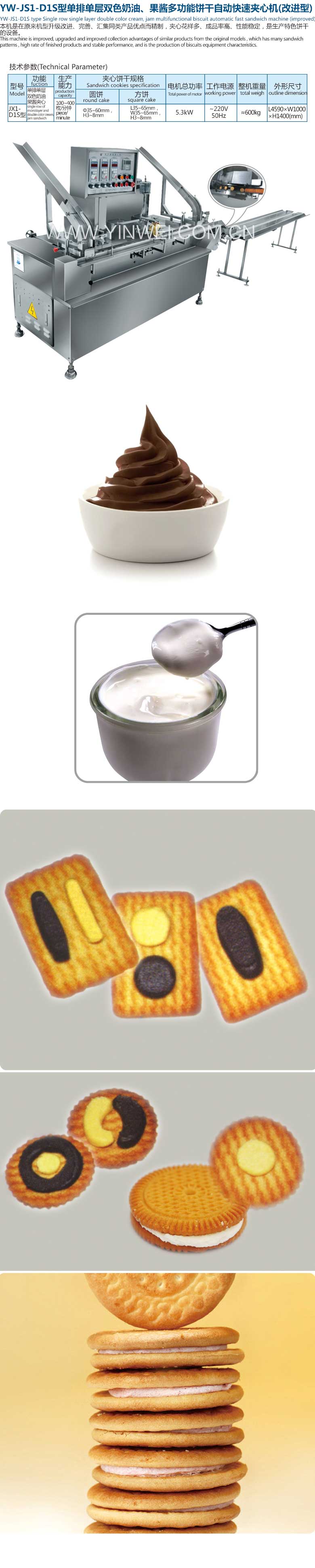 ②Photoelectric control, automatic detection of lack of bread, automatically close feeder when the machine stops, to ensure that no leakage of fillings, make the machine clean. ③Combined operation speed, more convenient operation; ④Amorphous chain bread,high production efficiency and high rate of finished products; ⑤Star wheel finishing cookies, can make cookies be arranged orderly; ⑥Star wheel rotor pump to replace the traditional gear pump, improve the un-iformity of each cookie sandwich fillings, and does not choke up p pump when is not used for long time ⑦Sandwich diversification, the function is more complete, suitable for jam, butter, around or before and after two kinds of color or monochrome sandwich; ⑧Sandwich fillings have great variety ,quantity of material can be adjusted conveniently; ⑨Automatic temperature control, ensure the constant temperature of the stuff; ⑩When Long, square, round, ellipse,and other different specification of sandwich biscuit converse kinds, different parts can quickly adjust and conveniently, the whole machine is mainly made of stainless steel,and has novel appearance, in line with food hygiene requirements. |