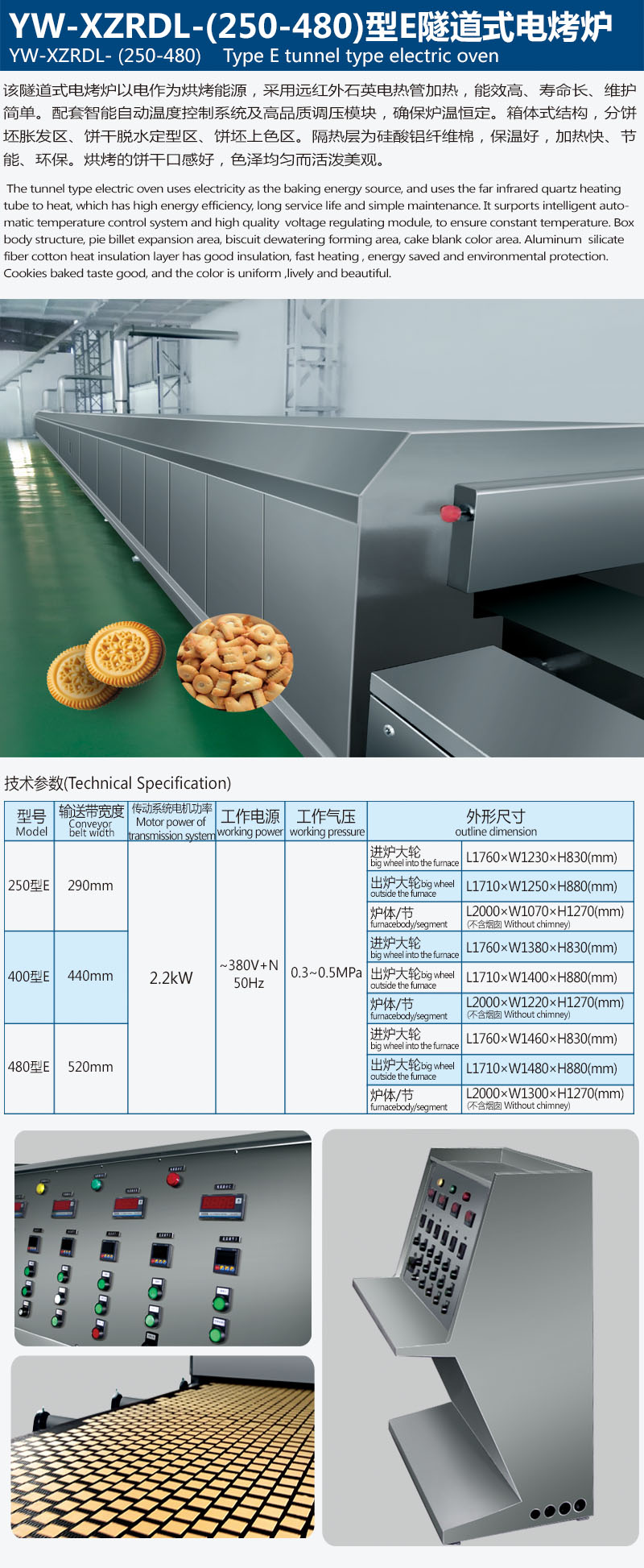 The tunnel type electric oven uses electricity as the baking energy source, and uses the far infrared quartz heating tube to heat, which has high energy efficiency, long service life and simple maintenance. It surports intelligent automatic temperature control system and high quality voltage regulating module, to ensure constant temperature. Box body structure, pie billet expansion area, biscuit dewatering forming area, cake blank color area. Aluminum silicate fiber cotton heat insulation layer has good insulation, fast heating , energy saved and environmental protection. Cookies baked taste good, and the color is uniform ,lively and beautiful.
